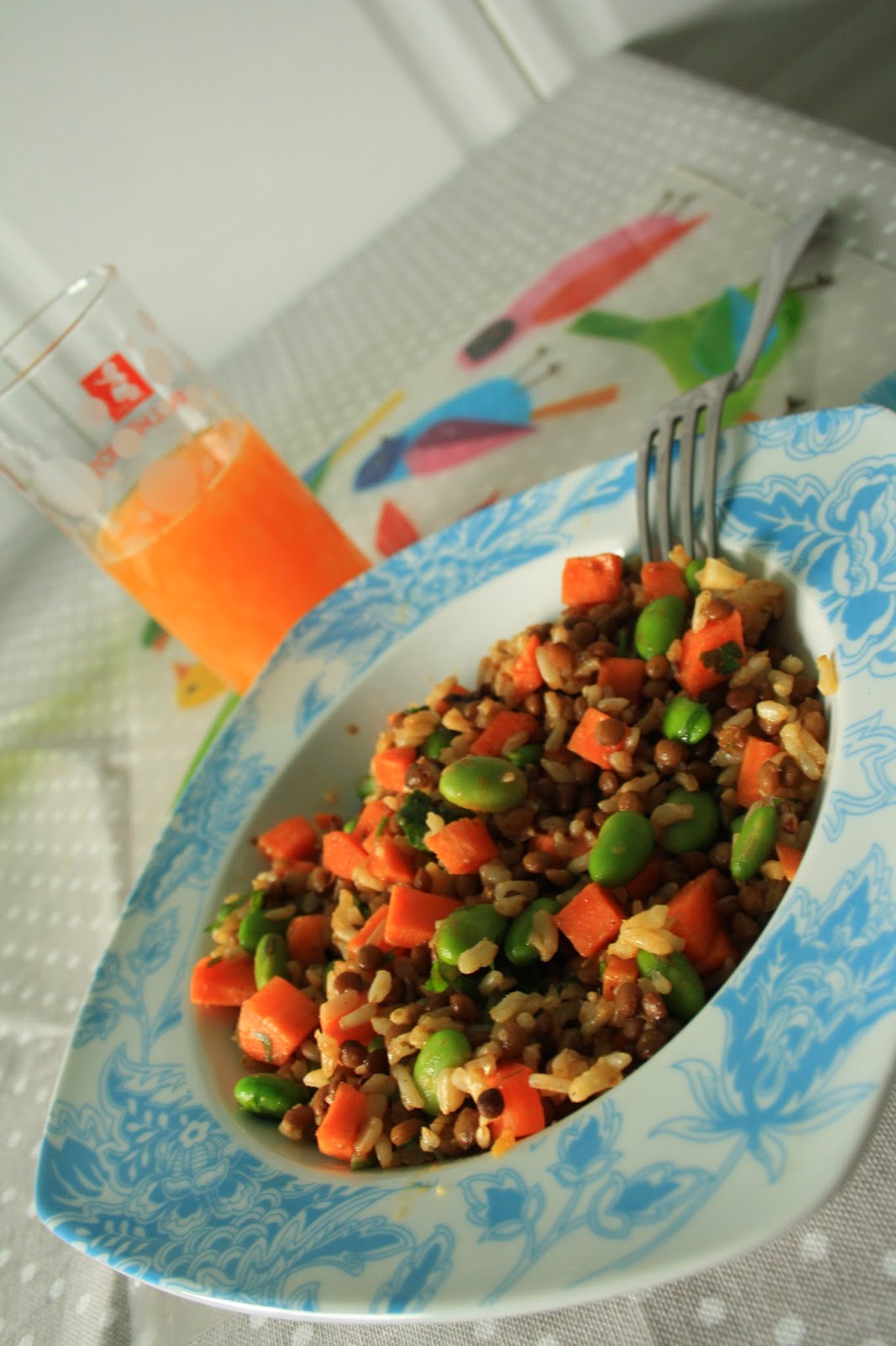 - Numa outra taça colocar os restantes ingredientes: arroz, lentilhas, cenoura, salsa, soja e misturar;